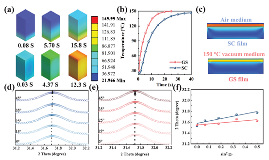 图 2. a) 采用 SC和 GS工艺进行退火下热场分布的有限元分析; b) 钙钛矿薄膜表面温度随退火时间的变化;c) GS 和 SC 热处理下钙钛矿层应力分布的比较;d-e) 在固定 φ 角为 0.2°且 φ 角变化范围为 31.2°至 32.2°的条件下, d) SC 和 e) GS 薄膜样品的 GI-XRD 衍射峰位移;f) 从 XRD 图谱提取的钙钛矿薄膜的 2θ-sin²ψ线性拟合图;