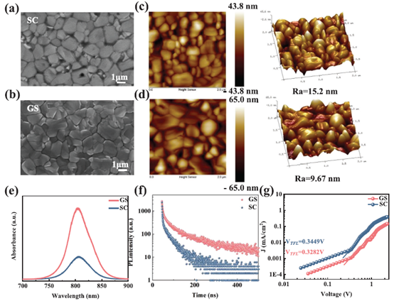 图 4. a-b)钙钛矿薄膜在(a) SC 和(b) GS 工艺下的 SEM 图;c-d) 钙钛矿薄膜在(c) SC 和(d) GS 工艺下的二维(左)及对应三维(右)表面形貌 AFM 图;e) SC 和 GS 方法所制备钙钛矿薄膜的 PL 光谱;f) SC 和 GS 方法所制备钙钛矿薄膜的 TRPL 光谱;g) 采用 SC 和 GS 工艺制备的单电子器件的 SCLC曲线。