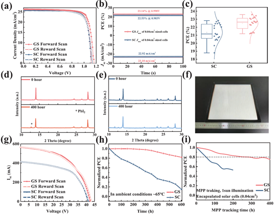 图5. a) 两种热处理下的钙钛矿太阳能电池的J-V曲线图;b) 通过SC和GS方法制备的钙钛矿太阳能电池在最大功率点(MPP)下的稳态效率和电流密度;c) 两种方法电池器件的效率统计分布图;d-e) SC和GS方法制备的钙钛矿膜在老化400小时并保持65°C条件前后的XRD图谱;f) 钙钛矿太阳能电池的组件实物图;g) 两种方法的钙钛矿模组的J-CV曲线。h) 未封装器件在氮气环境下、室温持续照射下的MPP长期稳定性。i) 电池在65°C热老化下的持续稳定性;