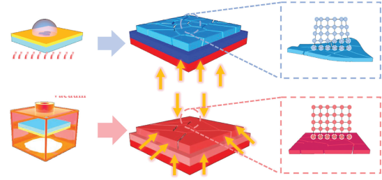 图 1. 传统溶液法(SC)和气固反应法(GS) 制备钙钛矿薄膜的热场原理及其对热应力影响示意图。