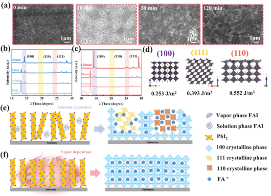 钙钛矿太阳能电池作为一种前景广阔的光伏技术,目前仍面临制备过程中的关键挑战:在传统基于溶液法的自下而上热退火工艺中,因材料间热膨胀系数不匹配,容易在钙钛矿薄膜中引入残余应变,从而显著降低器件的光伏性能,并制约其规模化制备。针对这一问题,本文提出了一种通过构建均匀热场,结合气-固(GS)反应与同步退火过程,以实现钙钛矿薄膜应力释放的新策略。在该过程中,通过控制甲脒碘化物(FAI)蒸气缓慢扩散并嵌入碘化铅(PbI₂)薄膜,实现了纯α相黑色 FAPbI₃钙钛矿的生成,从而精准调控了钙钛矿晶体的生长动力学并有效缓解了残余应变。该热管理方法进一步促进了钙钛矿薄膜的取向结晶,降低了缺陷态密度,使器件的功率转换效率(PCE)从对照组的 22.77% 提升至 23.58%,并显著增强了其运行稳定性。此外,该方法在实现颜色可调性及大面积钙钛矿太阳能组件(PSM,面积 859.1 cm²)的制备中也展现出良好适用性,组件 PCE 由 12.74% 提升至 16.56%。本研究凸显了热场调控在实现低应力、可扩展钙钛矿薄膜制备中的关键作用。