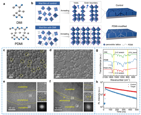 图 1. (a) DMI和PDMI的分子结构;(b) 钙钛矿薄膜形成过程中PDMI原位聚合过程的示意图;(c) 对照和(d) 目标钙钛矿薄膜的俯视SEM图像;(e) 对照和(f) 目标钙钛矿薄膜的HRTEM图像及FFT分析;(g) DMI单体、PDMI及PbI₂-CPDMI粉末的FTIR谱图;(h) 对照与目标钙钛矿薄膜的时间分辨光致发光(PL)光谱。