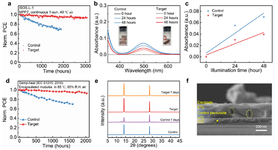 图 3. (a) 封装后的对照与目标太阳能组件在40°C空气中连续光照下最大功率点跟踪的运行稳定性;(b) 对照与目标薄膜在1个太阳光照下浸泡48小时后甲苯溶液的紫外-可见吸收光谱,插图为光照48小时后装有薄膜的密封样品瓶照片;(c) 对照与目标薄膜的紫外-可见吸光度随光照时间的变化;(d) 封装太阳能组件在85%相对湿度和85°C条件下老化时间与归一化效率(PCE)的关系;(e) 对照与目标钙钛矿薄膜在85°C黑暗条件下储存7天的XRD图谱演变;(f) 在85°C储存7天后对照器件的截面SEM图像。