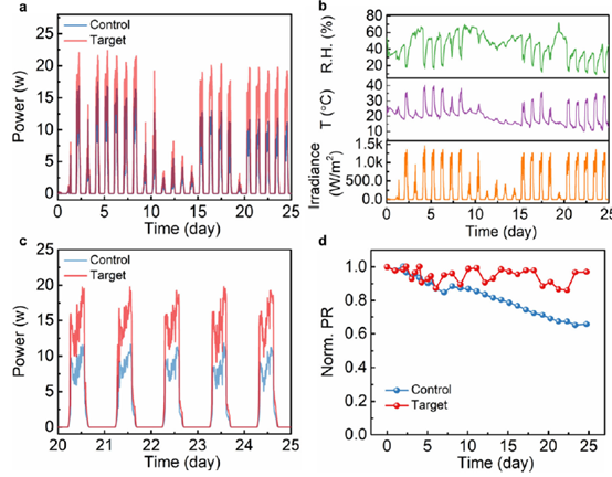 图4. (a) 封装对照与目标组件在真实户外条件(ISOS-O-2)下的功率输出;(b) 对应的辐照度、温度和相对湿度条件;(c) 户外暴露最后5天内封装对照与目标组件的功率输出选定数据;(d) 25天户外测试期间对照与目标组件的归一化性能比。