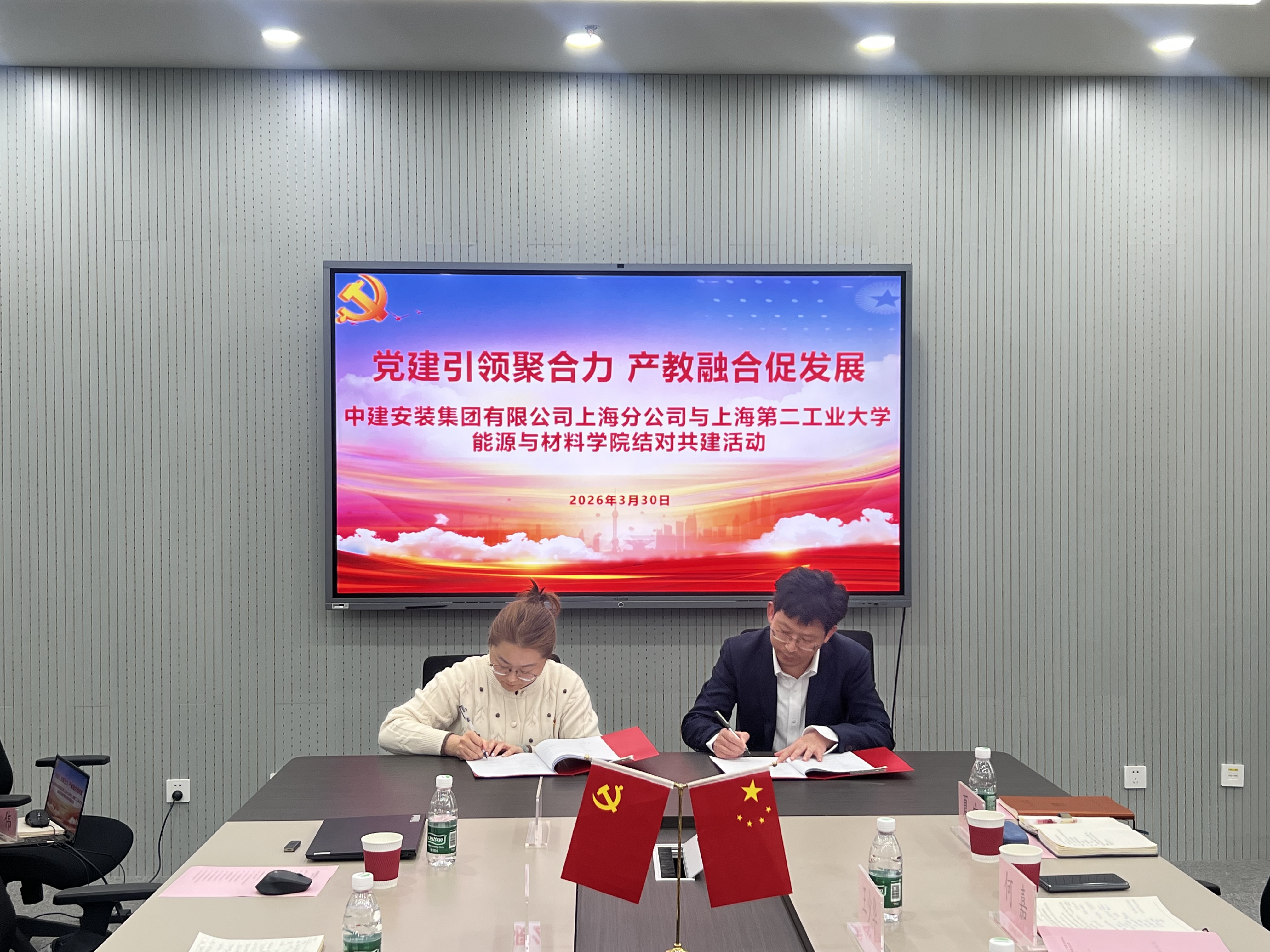 3月30日下午,中建安装集团有限公司上海公司与能源与材料学院在28号楼212会议室联合开展“党建引领聚合力,产教融合促发展”结对共建活动。中建安装集团有限公司上海公司总工程师王少华、能材学院党委书记陈勇、校产学合作办公室副主任余平参加了活动,活动由学院党委副书记干伟伟主持。