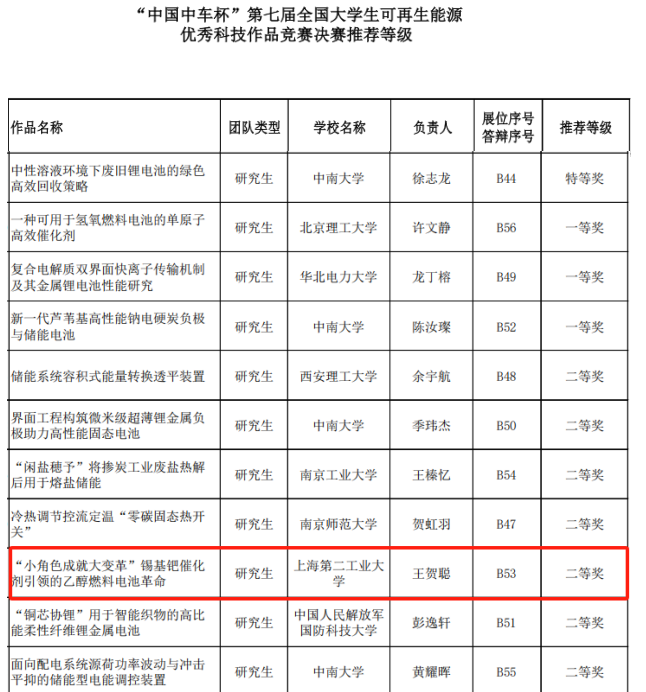 5月25日,备受瞩目的“中国中车杯”第七届全国大学生可再生能源优秀科技作品竞赛决赛圆满收官。我院24级研究生王贺聪团队凭借《“小角色成就大变革”锡基钯催化剂引领的乙醇燃料电池革命》(指导老师:林东海)从众多参赛作品中脱颖而出,喜获国赛二等奖。此外,24级研究生张健伟团队《“彩鳞晶映”光催化活性的反蛋白石光子品体膜》(指导老师:陈诚)获得国赛三等奖。