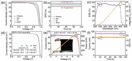 Fig. 3.a) Current-voltage (J-V) characteristics of optimal perovskite solar cells (PSCs) without covering a two-dimensional perovskite layer and covering different two-dimensional perovskite layers; B) the stable power output of the above optimal PSCs; c) the external quantum efficiency (EQE) of the optimal PSCs based on benzodiimidazole (BzDI); D) Current-voltage (J-V) characteristic output of optimal PSCs of cesium rubidium formamidine (CsFA) group covering the BzDI layer; E) Current-voltage (I-V) characteristics of an optimal perovskite component based on BzDI with an effective area of 38.9 cm ² (inset: Photograph of the optimal component); F) Stable power output and stable photocurrent output of an optimal perovskite solar module based on BzDI.
