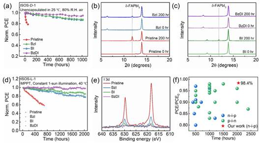 Fig. 4.a) Unencapsulated perovskite solar cells (PSCs) in air at 25.d egree. C. and 80% relative humidity (R.H.), Normalized power conversion efficiency (PCE) versus aging time; B) and c) the original perovskite film, the perovskite film based on benzimidazole (bzi), biimidazole (bi) and benzodiimidazole (bzdi) at 25 c, X-ray diffraction (XRD) patterns of 80% relative humidity before and after storage for 200 h; D) encapsulated perovskite solar cells (PSCs) in air at 40 ℃ under constant 1 solar illumination and maximum power point tracking (MPP) conditions, Normalized power conversion efficiency (PCE) versus aging time; E) X-ray photoelectron spectroscopy (XPS) I 3d spectra of the surface of hole transport layer (HTL) in aged perovskite solar cells (PSCs); F) Comparison of the operational stability of highly efficient (power conversion efficiency PCE > 25%) perovskite solar cells (PSCs) reported in the literature.