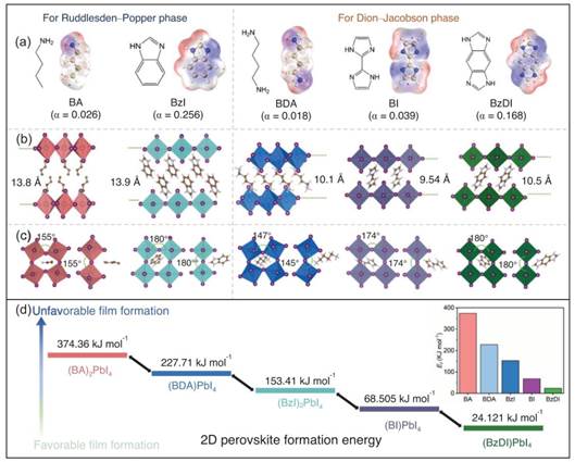 Fig. 1.a) Electrostatic potential diagram and force constants of n-butylamine (BA), benzimidazole (BzI), 1,4-butanediamine (BDA), biimidazole (BI) and benzodiimidazole (BzDI); B) the crystal structure observed along the out-of-plane direction (perpendicular to the stacking axis); c) the in-plane and out-of-plane distortion of two-dimensional perovskites; d) the difference in relative formation energy between different two-dimensional perovskites (n = 1).