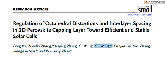 Recently, Wang Xin, a young teacher of CAMS & PUMC, has published a series of articles in the world-renowned journal Small (JCR Zone 1, Chinese Academy of Sciences Zone 2 Top). If = 12.1) Co-authored and published a research paper entitled Regulation of Octahral Districts and Interlayer Spacing in 2D Perovskite Capping LayerToward Efficiency and Stable Solar Cells, Dr. Wang Xin of the Institute of Aeronautics and Astronautics, Prof. Sun Xiangnan and Prof. Zhao Xiaoming of Nanjing University of Aeronautics and Astronautics are co-corresponding authors.