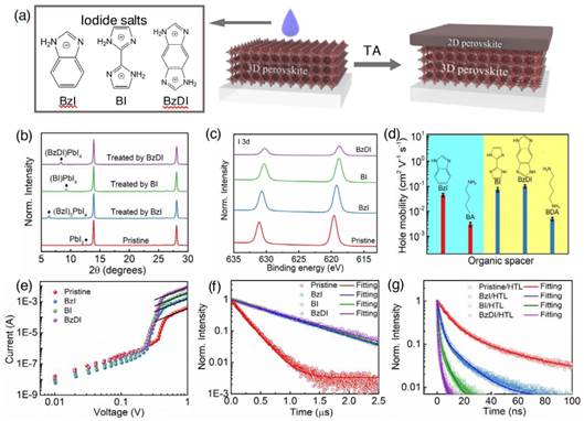 Fig. 2.a) a schematic diagram of the preparation of two-dimensional / three-dimensional (2D / 3D) perovskite using imidazole-based spacers; X-ray diffraction (XRD) patterns of the original perovskite film and the surface-treated perovskite film excited from the film side; c) X-ray photoelectron spectroscopy (XPS) I 3d patterns of the above two films; D) out-of-plane hole mobility of two-dimensional perovskite based on different spacers, e) dark state current-voltage (I-V) curve of hole-only devices; F) Time-resolved photoluminescence (TRPL) transient curves of the original perovskite film and the perovskite film covered with different two-dimensional perovskite layers; G) TRPL curve of perovskite / two-dimensional cladding / hole transport layer (HTL) stack structure.